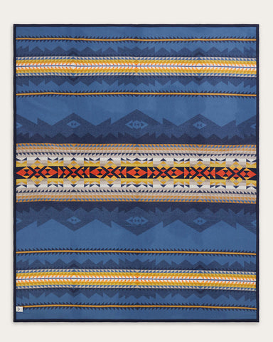 Fields of wildflowers are banded by peaks that represent the mountains of the Cascade Volcanic Arc. Also known as Cascadia, this range stretches from Lassen Peak in California, to the Silverthrone Caldera in British Columbia, Canada. The towering snow-capped peaks include Mount Hood and Mount Rainier in the Pacific Northwest. The center band represents the floral bounty that blooms in the rich volcanic soil near these dormant volcanoes: coreopsis, marigolds, poppies, and so many more.