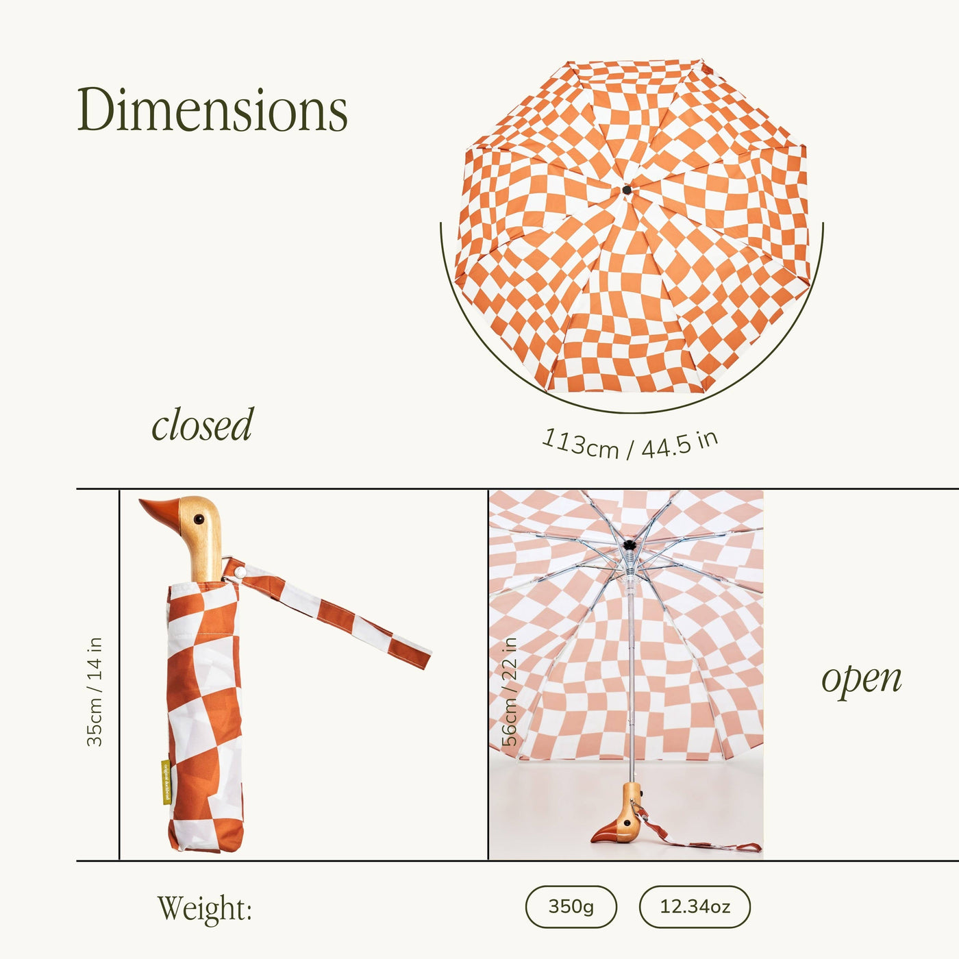 Every umbrella is designed in London and handmade with care, combining eco-friendly materials, premium craftsmanship, and playful design. Each canopy is made from 9 recycled plastic bottles, transforming waste into a durable, water-resistant fabric. The signature duck-head handle is carved from sustainably sourced, FSC-certified birch wood, making each umbrella unique and instantly recognisable.