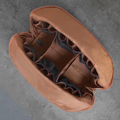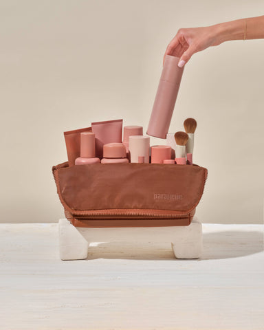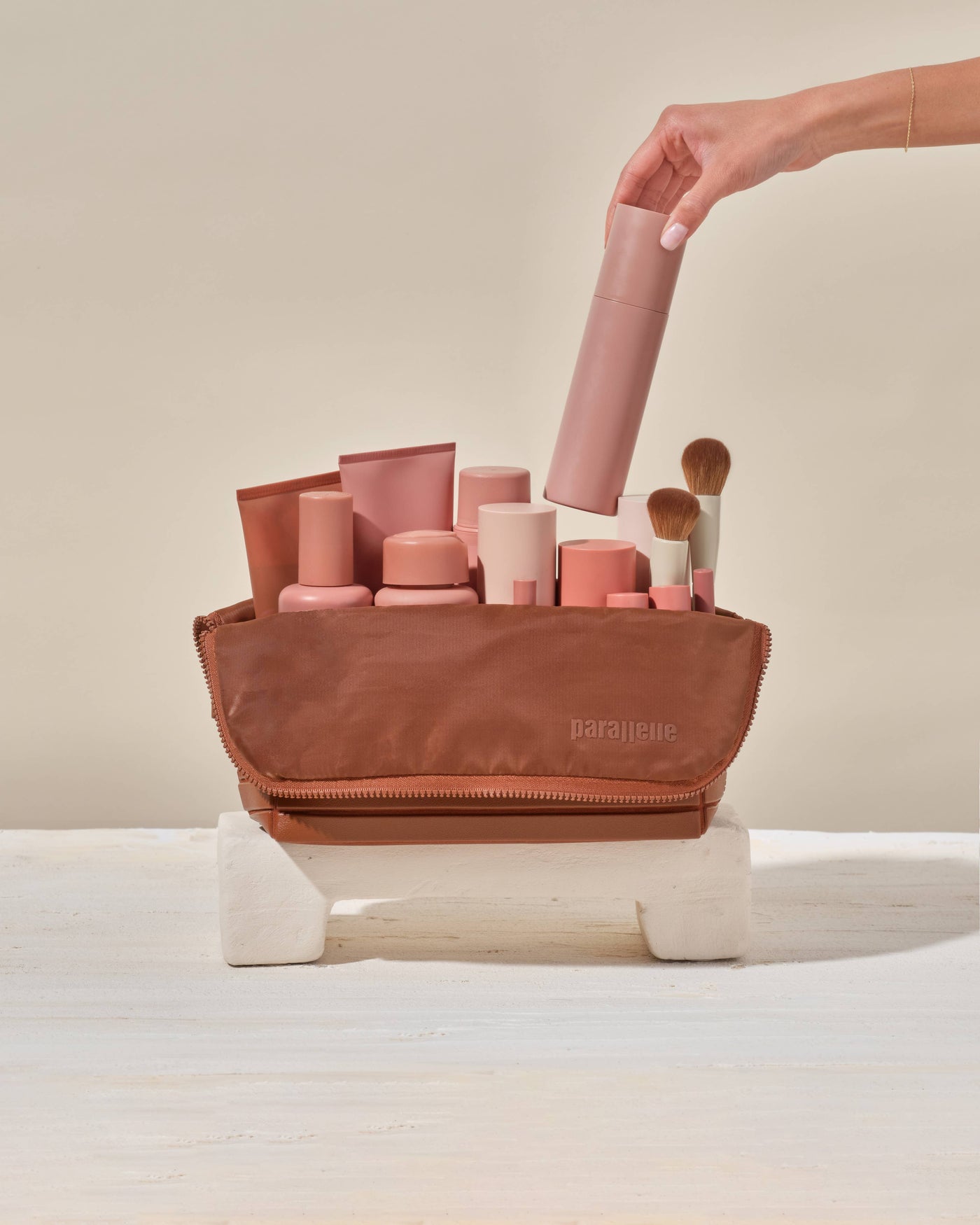 Our large-sized Traveller, the Check-In, is designed for extended trips and for overpackers. The large Traveller amply accommodates all your toiletries vertically in one place. With our patent-pending foldable shape, the bag effortlessly unfolds and reveals a meticulously organized interior. Everything inside remains visible and accessible at all times, eliminating the need for unpacking.